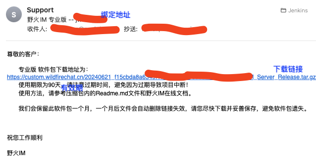专业版IM服务软件包一般都是通过邮件发送给客户端。在邮件上会写明绑定的地址、有效期和下载链接。如下图所示: